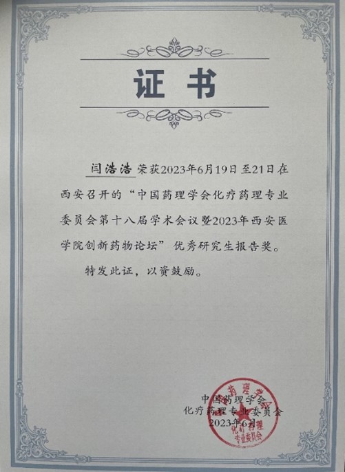 应大会组委会邀请,药学院教师陈云雨副教授主持了研究生论坛,并当选为中国药理学会化疗药理专业委员会第十届青年委员。药理学硕士生闫浩浩参加了研究生论坛,通过口头报告展示了研究团队在新冠病毒木瓜样蛋白酶抑制剂高效筛选方法建立与应用方面的研究成果,并获优秀研究生报告奖。上述研究成果主要发表在Virology、Journal of Medical Virology、Phytotherapy Research、STAR Protocols、《生物工程学报》和《中国现代应用药学》等杂志,并申请国家发明专利1件。